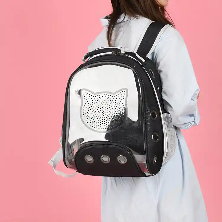 Hermoso morral cargador para gatos hasta 7 u 8 kilos. Material en tela con visos de hilo brillante. La cara de gato tambien tiene orificios para mayor ventilaciòn. Tapa transparente en plàstico grueso. Medidas: 40 cm alto x 19 cm fondo x 32 cm ancho