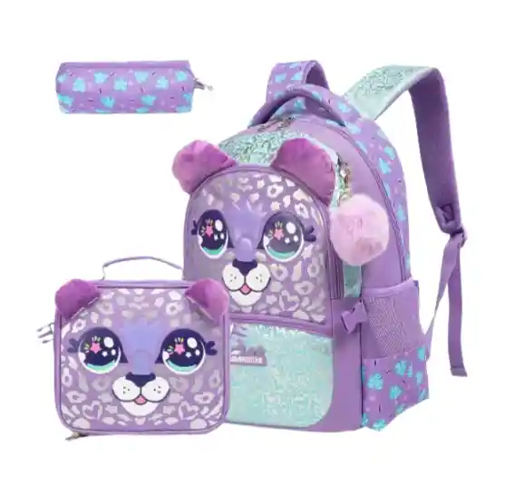 "Bolso, cartuchera y lonchera Geopardo: ¡Un set salvaje y lleno de estilo! Con estampado de leopardo, lleva tu estilo a todas partes con estos accesorios coordinados."