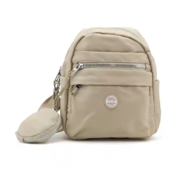 Morral paqueño con compartimento principal, bolsillo frontal medio y un bolsillo exterior inferior con cremallera, con bolsillos laterales de tela elástica para botellas o artículos pequeños y logotipo rectangular de "SLOW FLOW" centrado en el panel frontal superior, Incluye un pequeño monedero o estuche circular removible que cuelga del lateral, ideal para monedas, auriculares o llaves, cargaderas ajustables con frase decorativa, elaborado en Nylon con cierres metalicos, garantían de 3 meses directamente con el vendedor en cierres, herrajes y costuras