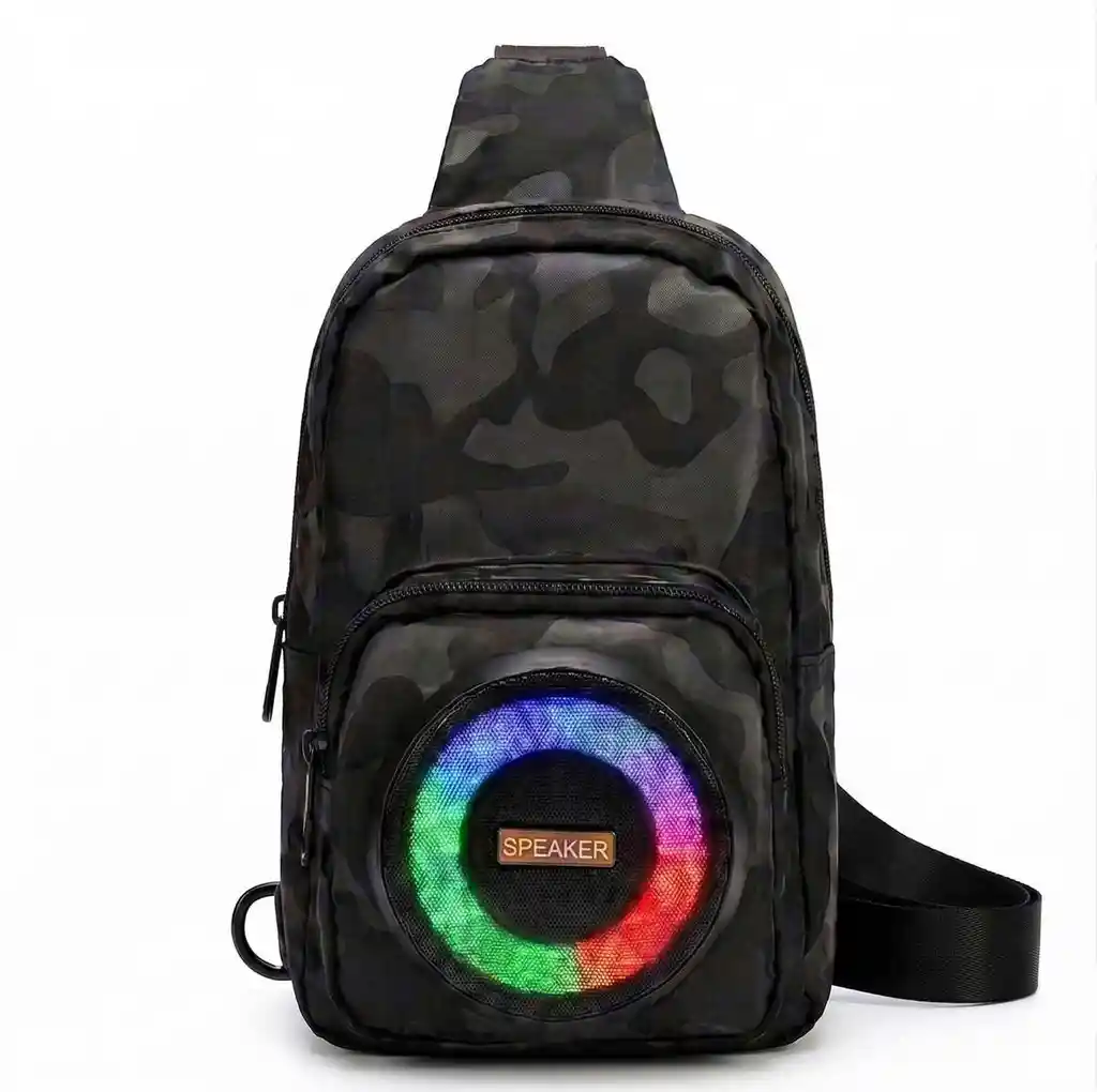 Este innovador morral tipo pechera combina estilo urbano y tecnología de vanguardia, diseñado para quienes buscan llevar su música a todas partes con total comodidad y manos libres. Fabricado en lona de alta resistencia con un moderno acabado camuflado, integra en su compartimento frontal un potente parlante Bluetooth de alta fidelidad rodeado por un aro de luces LED RGB rítmicas que cambian al son de tus canciones. Su diseño ergonómico de una sola correa ajustable y acolchada permite un acceso rápido a tus pertenencias, mientras que sus múltiples compartimentos internos ofrecen el espacio perfecto para organizar de manera segura tu celular, cargadores y objetos personales, convirtiéndolo en el accesorio definitivo para viajes, paseos en bicicleta o actividades al aire libre con una experiencia sonora inmersiva. Ficha Técnica Producto: Morral Pechera con Parlante Integrado Material: Poliéster / Lona de alta densidad resistente al desgaste Tipo de parlante: Bluetooth inalámbrico integrado Iluminación: Aro LED RGB con efectos rítmicos Conectividad: Bluetooth compatible con Android e iOS Autonomía de batería: Hasta 4 horas de reproducción continua (según volumen) Puerto de carga: Micro USB / USB (5V) Dimensiones: 31 cm de alto x 18 cm de ancho x 10 cm de profundidad Correa: Ajustable y acolchada con opción de cambio de lado (izquierdo o derecho) Compartimentos: 2 bolsillos principales con cremallera y organizador interno Voltaje de carga: 5V DC Resistencia al agua: Repelente a salpicaduras leves ** _Para defectos de fábrica o retractos: \**_Por favor revise el producto apenas lo reciba y antes de usarlo. No aplican ley de retracto o defectos de fábrica luego de usar el producto. Se manejan máximo 5 días para reportar defectos de fábrica (por ejemplo, producto funciona mal, piezas faltantes, rotas, etc). Para hacer efectiva la devolución el producto debe devolverse con el empaque original, el cual debe estar en buen estado, incluir todos los documentos y las partes completas y sin daños.