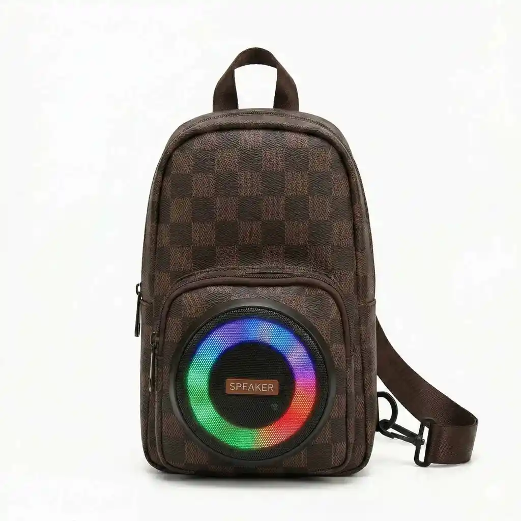 Este innovador morral tipo pechera combina estilo urbano y tecnología de vanguardia, diseñado para quienes buscan llevar su música a todas partes con total comodidad y manos libres. Fabricado en lona de alta resistencia con un moderno acabado camuflado, integra en su compartimento frontal un potente parlante Bluetooth de alta fidelidad rodeado por un aro de luces LED RGB rítmicas que cambian al son de tus canciones. Su diseño ergonómico de una sola correa ajustable y acolchada permite un acceso rápido a tus pertenencias, mientras que sus múltiples compartimentos internos ofrecen el espacio perfecto para organizar de manera segura tu celular, cargadores y objetos personales, convirtiéndolo en el accesorio definitivo para viajes, paseos en bicicleta o actividades al aire libre con una experiencia sonora inmersiva. Ficha Técnica Producto: Morral Pechera con Parlante Integrado Material: Poliéster / Lona de alta densidad resistente al desgaste Tipo de parlante: Bluetooth inalámbrico integrado Iluminación: Aro LED RGB con efectos rítmicos Conectividad: Bluetooth compatible con Android e iOS Autonomía de batería: Hasta 4 horas de reproducción continua (según volumen) Puerto de carga: Micro USB / USB (5V) Dimensiones: 31 cm de alto x 18 cm de ancho x 10 cm de profundidad Correa: Ajustable y acolchada con opción de cambio de lado (izquierdo o derecho) Compartimentos: 2 bolsillos principales con cremallera y organizador interno Voltaje de carga: 5V DC Resistencia al agua: Repelente a salpicaduras leves ** _Para defectos de fábrica o retractos: \**_Por favor revise el producto apenas lo reciba y antes de usarlo. No aplican ley de retracto o defectos de fábrica luego de usar el producto. Se manejan máximo 5 días para reportar defectos de fábrica (por ejemplo, producto funciona mal, piezas faltantes, rotas, etc). Para hacer efectiva la devolución el producto debe devolverse con el empaque original, el cual debe estar en buen estado, incluir todos los documentos y las partes completas y sin daños.
