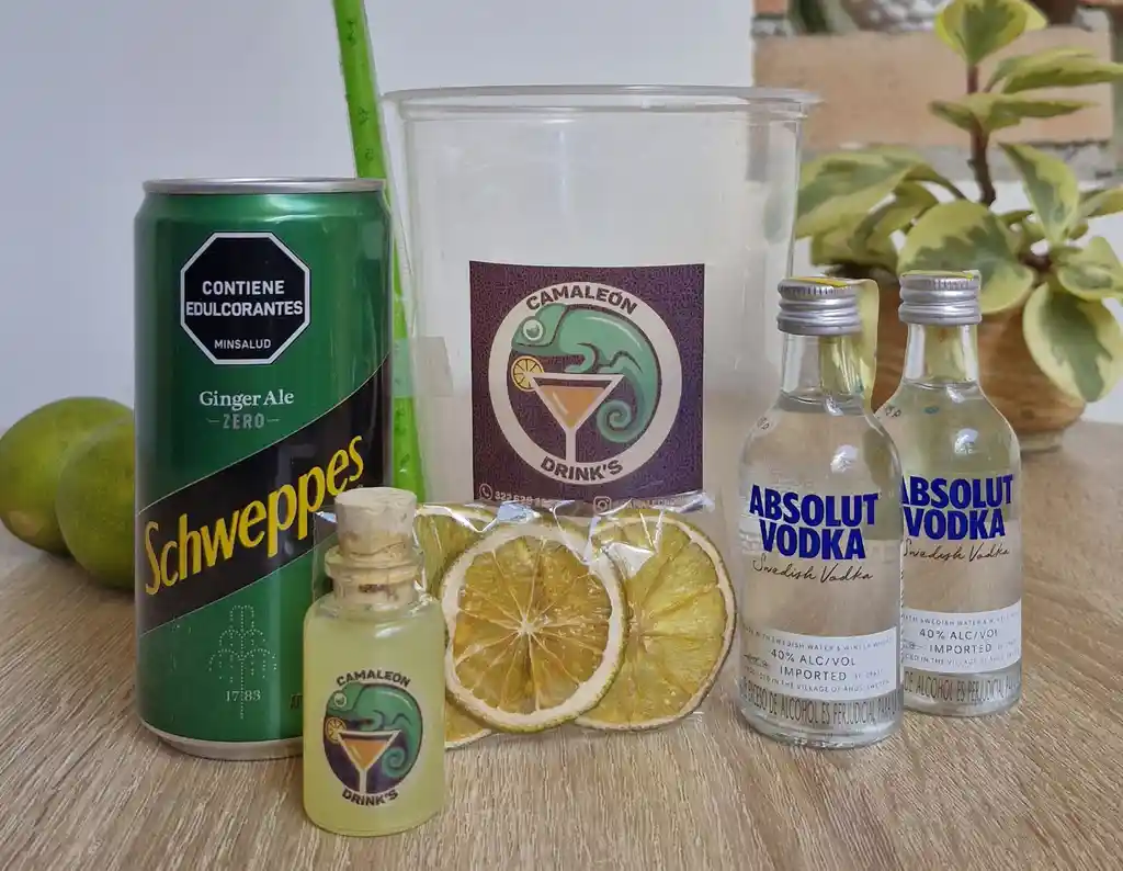 Prepara tu cóctel en segundos. Solo agrega hielo, mezcla y disfruta. Incluye: 2 mini botellas de vodka, 1 ginger ale, 1 frasco de limón natural, garnituras (fruta deshidratada), vaso de 32 oz con pitillo plastico y receta del cóctel.