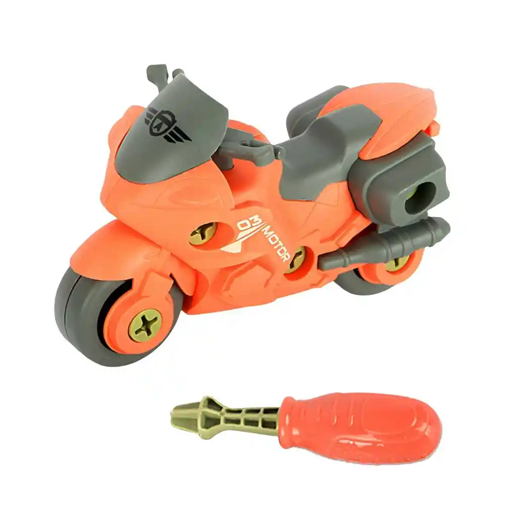 ¡Enciende la pasión por la ingeniería y la velocidad con nuestra increíble motocicleta de juguete para armar! Diseñada para pequeños mecánicos y futuros campeones de carreras, este kit permite a tu hijo usar el destornillador incluido para montar y desmontar su propia moto, pieza por pieza. Esta fascinante actividad no solo garantiza horas de entretenimiento, sino que también fomenta la concentración, la motricidad fina y las habilidades para resolver problemas de una manera increíblemente divertida. Una vez ensamblada, su diseño deportivo y vibrante color naranja la convierten en el vehículo perfecto para imaginar emocionantes carreras y aventuras en carretera, ofreciendo una experiencia de juego completa que va desde el taller hasta la pista. Ficha Técnica: Dimensiones : 16 cm x 12 cm x 7 cm Material: Plástico ABS Edad Apta : + 3 años Certificado de conformidad: SL-CS-210044 Referencia: 3341-X1A ** _Para defectos de fábrica o retractos: \_Por favor revise el producto apenas lo reciba y antes de usarlo. No aplican ley de retracto o defectos de fábrica luego de usar el producto. Se manejan máximo 5 días para reportar defectos de fábrica (por ejemplo, producto funciona mal, piezas faltantes, rotas, etc). Para hacer efectiva la devolución el producto debe devolverse con el empaque original, el cual debe estar en buen estado, incluir todos los documentos y las partes completas y sin daños.