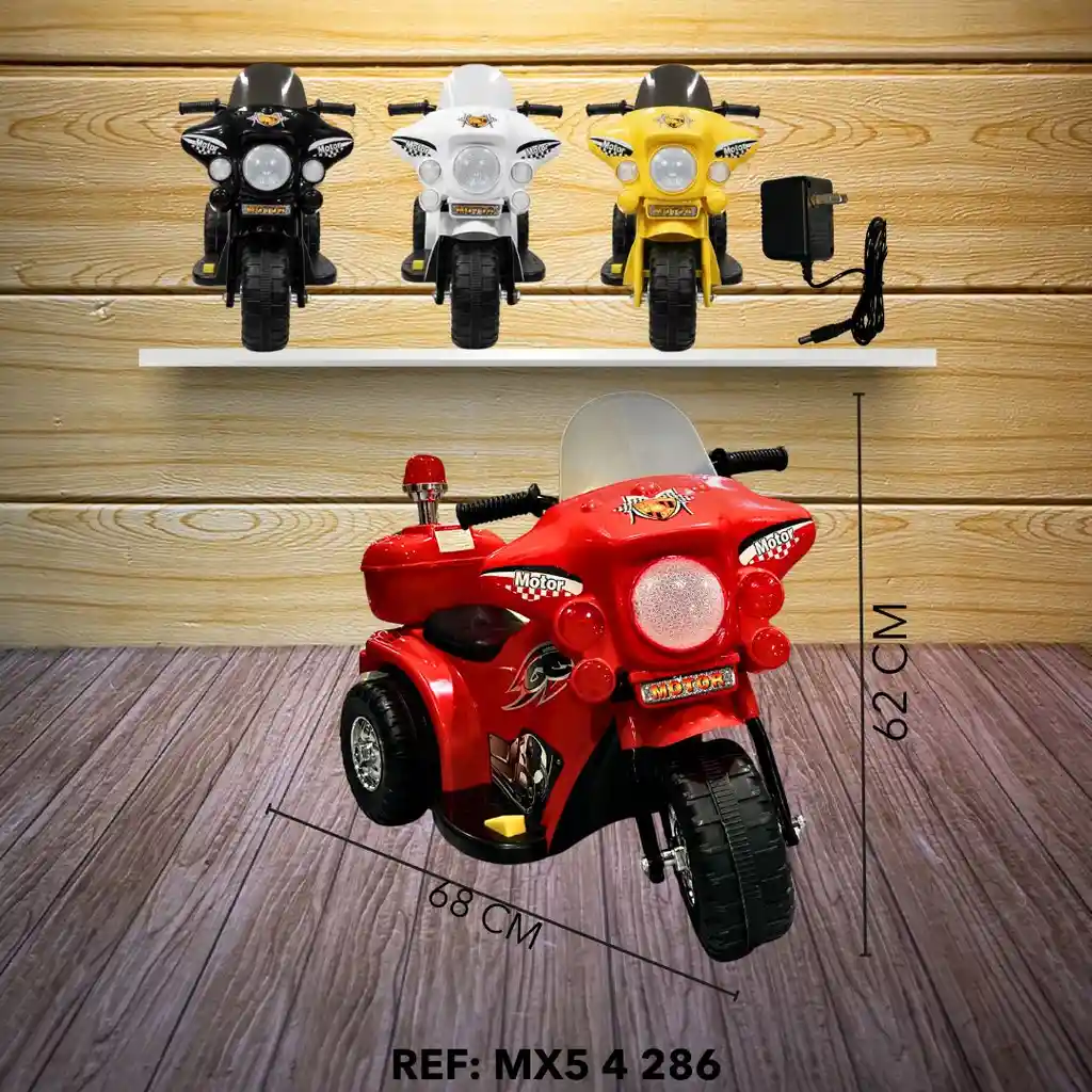 *💥 TRICICLO ELÉCTRICO RECARGABLE (MOTO) 💥* *• FUNCIÓN:* Proporciona un vehículo infantil de montar con motor eléctrico, luces y sonidos, ideal para el entretenimiento activo de los niños y para desarrollar sus habilidades motoras. *• CARACTERÍSTICAS:* • Tipo: Triciclo eléctrico tipo motocicleta. • Diseño: Color rojo brillante con calcomanías de carreras ("Motor"). • Accesorios: Incluye luces frontales, sirena/alarma y baúl trasero. • Alimentación: Recargable. • Seguridad: Diseño de tres ruedas para mayor estabilidad. *• Colores disponibles:* Blanco, Negro, Amarillo y Rojo. *• MEDIDAS:* 68 CM de largo x 62 CM de alto.