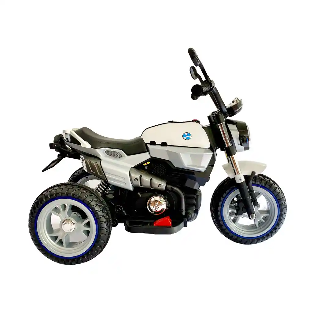 "MP3 Usb Auxiliar para reproducción de músicaSonido RealistaLuces Frontales y traseras.Moto Con 3 Ruedas-Música IntegradaRecomendada desde los 2 años en adelante.Soporta hasta 60 kg.Doble motor de 6v.Doble Batería Recargable.Disponible en Azul, Roja, Blanca"