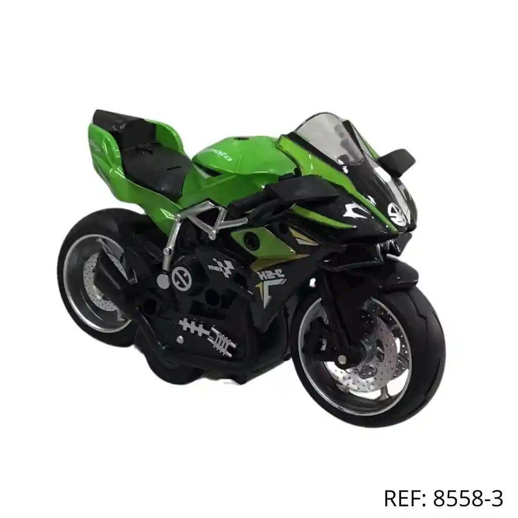 Motocicleta verde de diseño deportivo con detalles realistas. Ideal para coleccionistas y amantes de las motos