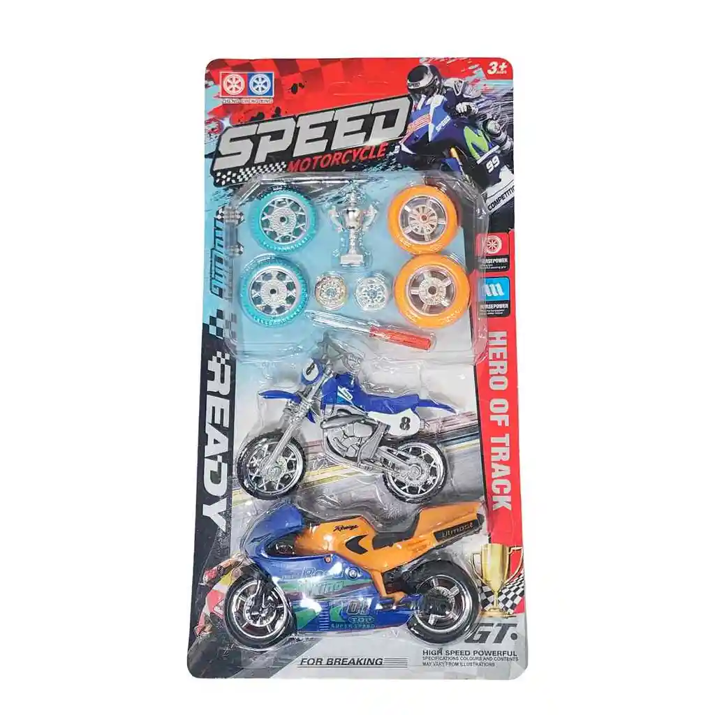 ¡Conviértete en el campeón de la pista y en un maestro mecánico con este increíble set de motocicletas desarmables! Este paquete no solo te da dos motos de carrera listas para la acción, sino también el poder de personalizarlas. Usa las herramientas incluidas para desmontar tus vehículos, cambiar las llantas con el juego de repuesto y ajustar cada detalle para crear la máquina de velocidad definitiva. Una vez que tu moto esté lista, desafía a tus amigos a emocionantes carreras y demuestra quién es el verdadero héroe de la pista. Es el regalo perfecto para los pequeños ingenieros y amantes de la velocidad, un set que desarrolla la creatividad, la motricidad fina y garantiza horas de diversión interactiva. Ficha Técnica: Material: Plástico ABS Dimensiones Del Vehículo : 13 cm x 6 cm x 5 cm Apto para: + 3 Años Referencia: 8769-5 Certificado de conformidad: CS-LCO-13233-2021S2/432 ** _Para defectos de fábrica o retractos: \_Por favor revise el producto apenas lo reciba y antes de usarlo. No aplican ley de retracto o defectos de fábrica luego de usar el producto. Se manejan máximo 5 días para reportar defectos de fábrica (por ejemplo, producto funciona mal, piezas faltantes, rotas, etc). Para hacer efectiva la devolución el producto debe devolverse con el empaque original, el cual debe estar en buen estado, incluir todos los documentos y las partes completas y sin daños.