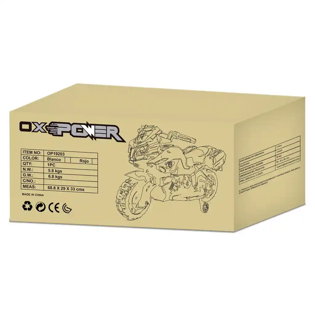 Motocicleta Infantil. Motor 20W OX TOYS OP19203 Roja A los niños les encanta soñar que conducen un gran vehículo, estos geniales “vehículos” son mucho más que juguetes, ya que además de hacerles pasar momentos muy divertidos y mejoran su desarrollo psicomotor, su capacidad de razonar y su socialización. Al mismo tiempo que los padres se preocupan por la seguridad de sus hijos, OX Power les brinda esa tranquilidad, confianza y seguridad con sus vehículos. Ox Toys es una marca líder que siempre busca la innovación en sus productos, desarrollando las capacidades cognitivas y motoras de los niños. Soporte en línea 24/7 Todos los productos están garantizados contra defectos de materiales y mano de obra por un período de 30 días. Nuestra política de devoluciones permite 30 días a partir de la fecha de entrega, SIEMPRE Y CUANDO los productos no se hayan utilizado y se encuentren dentro del mismo empaque (original), sin rotura de cintas, sellos o plástico protector. Las etiquetas, tags y sellos de advertencia deben estar todavia atados como originalmente se envían, todos los manuales completos, en buen estado y en su bolsa, sin que las etiquetas decorativas hayan sido pegadas en los productos, con cada una de las partes y accesorios ( paredes, techos, soportes, llantas, cabrillas, frenos, espejos, cabrilla de dirección) sin ensamblar y correctamente empacadas y protegidas separadamente, tal como fueron enviadas. Si los productos no cumplen con estas condiciones, la devolución podrá ser rechazada y / o estará sujeta an un cargo de re-empaque equivalente al 30%. Recomendamos encarecidamente que el comprador inspeccione minuciosamente el producto comprado antes de usarlo. El envío de devolución es responsabilidad del comprador. No se aceptar evoluciones por situaciones distintas a defectos después de 14 días a partir de la fecha de entrega. La garantía no se aplicará a productos en promoción, productos que se utilizan para un fin distinto para el que fueron diseñados, que han sufrido golpes o caídas, han estado expuestos a altas temperaturas, o que han sido alterados de alguna manera que sería perjudicial para el rendimiento o la vida útil del producto. La aplicación incorrecta, el mal uso o la negligencia revocarán la garantía. Hay un cargo automático de re-empaque equivalente al 20% del valor de las mercancías en devoluciones de 4 a más productos de una sola orden. Para que los productos puedan llegar de vuelta en perfecto estado, recomendamos que los devuelvan utilizando el empaque original en el que fueron recibidos. Las devoluciones correctamente procesadas serán tramitadas en un proceso que podrá tomarse de 10 a 15 dis hábiles. Despues de esto la entidad financiera del cliente podrá tomarse de 3 a 5 dias hábiles para mostrar el crédito reflejado en su banco. Depende estrictamente de la entidad financiera y el tipo de pago que haya sido utilizado. Este proceso aplica para productos comprados online únicamente. Las mercancías compradas en las tiendas, deben procesarse directamente en el lugar donde originalmente lo compraron. El transporte dela devolución de los los productos debe ser asumido directamente con el comprador.