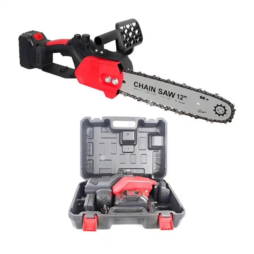 Esta potente motosierra inalámbrica de 12 pulgadas es la herramienta definitiva para trabajos de poda, tala forestal y corte de leña, combinando la fuerza de un motor de cobre puro con la libertad total de movimiento. Diseñada para un alto rendimiento, cuenta con una cadena de alta temperatura ultra resistente capaz de atravesar troncos de hasta 20 cm de grosor en pocos segundos, optimizando el tiempo y la energía en cada labor. Su estructura ergonómica incluye un mango antideslizante, protección contra salpicaduras y un sistema de lubricación eficiente, garantizando un manejo seguro y confortable incluso en jornadas exigentes. Equipada con dos baterías de litio de 48V de larga duración y un cargador rápido, esta motosierra portátil asegura una productividad ininterrumpida, convirtiéndose en el aliado indispensable para el mantenimiento de huertos, fincas y proyectos forestales profesionales o domésticos. FICHA TÉCNICA Producto: Motosierra de Mano Inalámbrica Profesional Tamaño de la Espada: 12 Pulgadas Potencia: Motor de núcleo de cobre puro de alta eficiencia Alimentación: 2 Baterías de Litio recargables de 48V Max Velocidad de Corte: Ajustable mediante gatillo de presión Capacidad de Corte: Troncos de hasta 20 cm de diámetro Dimensiones del Producto: 66 cm (Largo total) x 21 cm x 12 cm Seguridad: Botón de bloqueo de seguridad y protector de mano superior Accesorios Incluidos: 2 Baterías de 48V, cargador de pared, 1 cadena de repuesto y herramientas de ajuste Características: Sistema de ventilación mejorado, cadena de alta dureza y diseño portátil ligero Garantía: 1 mes por defectos de fábrica POLÍTICA DE GARANTÍA Y RETRACTO Este producto cuenta con 1 mes de garantía por defectos de fabricación (fallas en el motor o sistema eléctrico); por favor revise el equipo al recibirlo, ya que no aplica garantía por desgaste natural de la cadena, quemaduras del motor por sobreesfuerzo excesivo o golpes posteriores al uso. Dispone de máximo 5 días para reportar novedades (daños de transporte o piezas faltantes). Para cualquier devolución por retracto, el producto debe entregarse en su empaque original en perfecto estado, completamente limpio de aserrín o aceite y con todos sus accesorios completos.