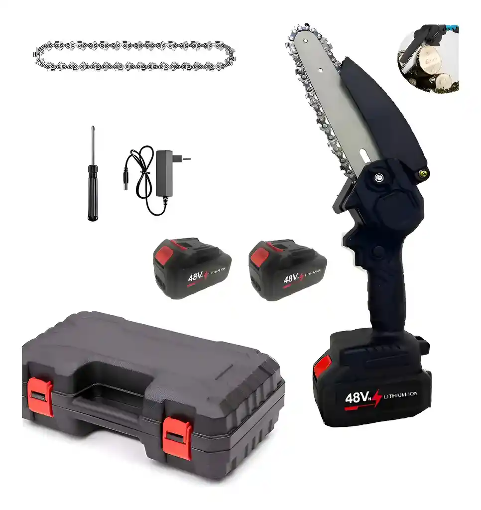 Portabilidad y diseño: Es totalmente inalámbrica y portátil, diseñada para ser manejada con una sola mano. Cuenta con un diseño ergonómico y ligero. incluye una maleta de transporte de alta resistencia para un almacenamiento seguro y organizado. Rendimiento: Funciona con un motor eléctrico de alto rendimiento alimentado por una batería de litio de 48V, proporcionando cortes potentes y constantes. La potencia alrededor de 600 W. Utiliza una cadena de corte afilada y resistente, con un mecanismo de protección superior. Permite cortar ramas de hasta 6 pulgadas (aproximadamente 15 cm) de diámetro eficientemente. Batería y accesorios: incluye dos baterías recargables de litio de 48V (2000mAh), lo que garantiza una mayor autonomía. El kit suele incluir accesorios como un cargador y un destornillador. Seguridad: Incorpora un interruptor de seguridad para evitar encendidos accidentales y mejorar el control. El sistema de seguridad evita activaciones accidentales y brinda mayor protección durante su uso.