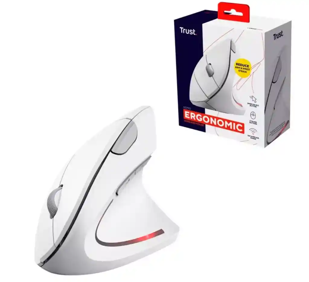 Mouse Trust Verto ergonómico vertical inalámbrico Blanco ADIÓS A LOS ESFUERZOS – Este ratón ergonómico es la solución vertical a la tensión y al dolor; su forma ergonómica posiciona naturalmente el brazo y la muñeca a 60 grados, para trabajar sin esfuerzo SIÉNTETE BIEN – Un ratón inalámbrico de diseño ligero, que se adapta a cualquier mano y que proporciona alivio; el soporte de pulgar y el revestimiento de goma optimizan el agarre y el confort LIBERTAD INALAMBRICA – No dejes que los cables influyan en tu postura de trabajo; el alcance inalámbrico de 10 metros del ratón Verto supone una libertad óptima y una adecuada postura CONTROL PRECISO – La ergonomía no tiene por qué ser aburrida; con este ratón de PC puedes acceder a un sensor óptico de 800/1200/1600 dpi y a dos botones de pulgar para un control preciso y rápido PLUG PLAY – Conecta el microrreceptor del ratón vertical Verto con tu PC/portátil y podrás empezar a trabajar al instante; guarda el receptor en el compartimento especial cuando acabes de trabajar