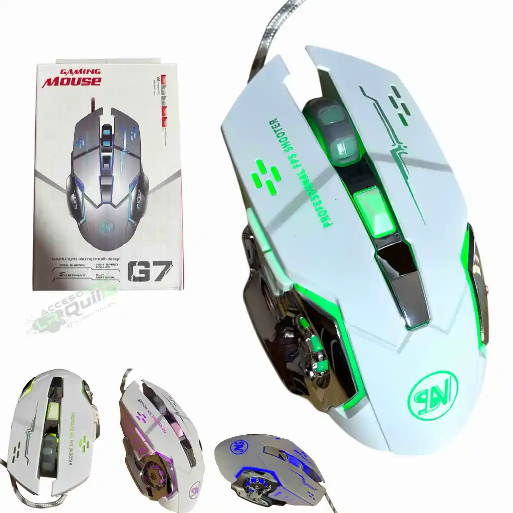 Modelo: G7 Clics silenciosos Este ratón cuenta con varias características clave: Diseño: Presenta formas geniales y un diseño ergonómico para usuarios diestros (en algunos modelos). Iluminación: Incorpora luces de colores con efecto de respiración. Rendimiento: Dispone de una rueda de alta velocidad y ajuste de DPI (puntos por pulgada), con resoluciones que pueden alcanzar hasta 3200 o 3600 DPI, dependiendo del modelo específico. Conectividad y Compatibilidad: Es un ratón con cable USB (en el modelo de la imagen y otros) y es compatible con sistemas operativos Windows, macOS y Linux. Longitud estándar: 1,5 metros. Tipo de cable: USB alámbrico, frecuentemente con recubrimiento de nylon para evitar enredos y aumentar la durabilidad. Otras características: 7 botones, iluminación LED multicolor y niveles de DPI ajustables
