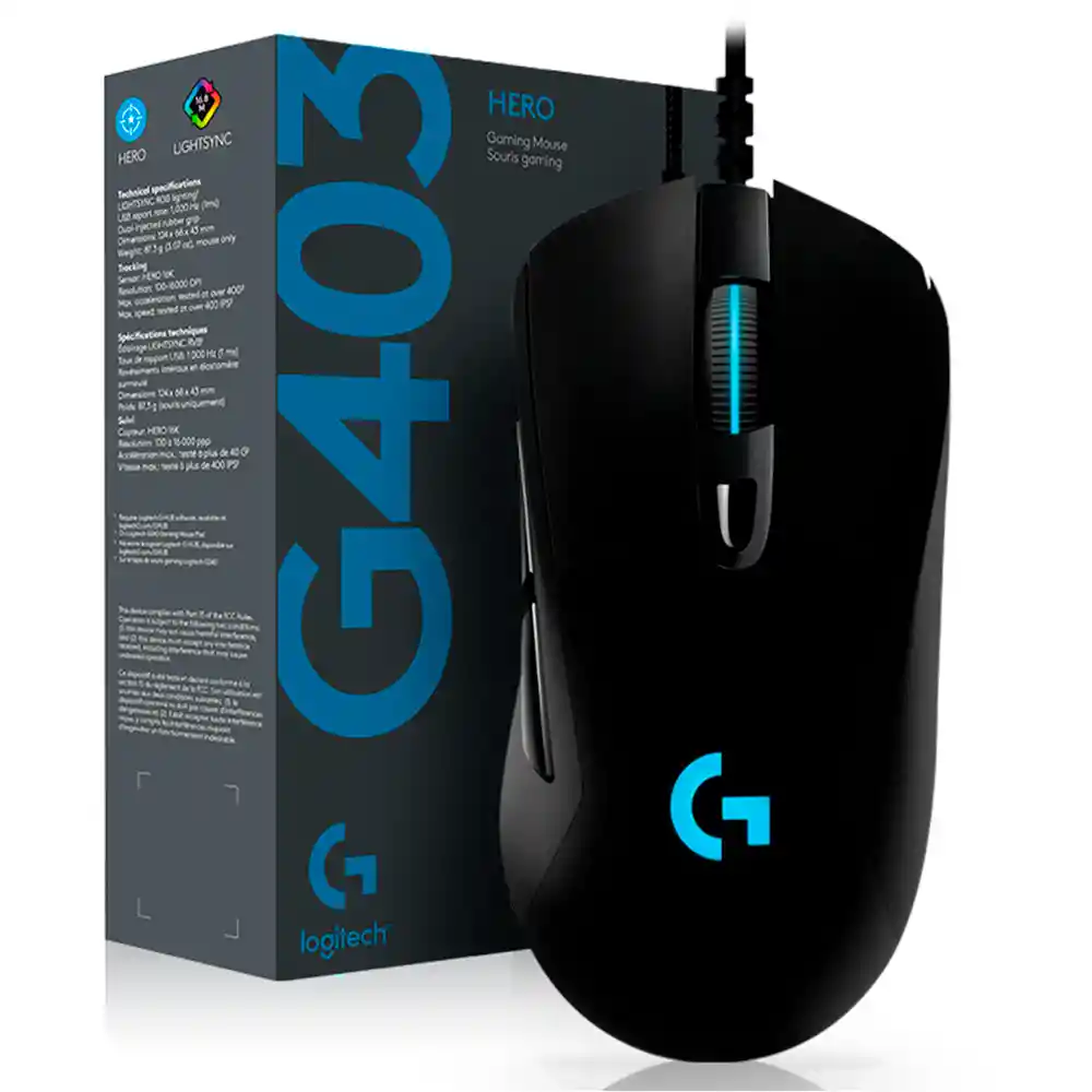 El Logitech G403 está equipado con el sensor HERO 25K, con seguimiento 1:1, 400+ IPS y una sensibilidad de 100 a 25.600 dpi sin suavizado, aceleración ni filtros. Su iluminación RGB LIGHTSYNC responde a juegos, audio y pantalla, y puede personalizarse con G HUB. Ofrece un diseño ergonómico, ligero, con recubrimiento de goma y una pesa extraíble de 10 g. Con 6 botones programables, tiempo de respuesta de 1 ms y sistema de tensión con resortes metálicos, garantiza precisión, velocidad y rendimiento en cada partida. Especificaciones: Seguimiento Sensor: HERO 25K Resolución: 100 – 25.600 dpi Aceleración máxima: probada a más de 40 G Velocidad máxima: probada a más de 400 IPS Respuesta Formato de datos USB: 16 bits/eje Velocidad de respuesta USB: 1000 Hz (1 ms) Microprocesador: ARM de 32 bits Especificaciones físicas Altura: 124 mm Anchura: 68 mm Profundidad: 43 mm Peso: 87,3 g, sólo mouse Pesa opcional adicional: 10 g Longitud del cable: 2,1 m Incluye: Mouse G403 Pesa Opcional de 10g Manual de usuario Garantía: 24 meses