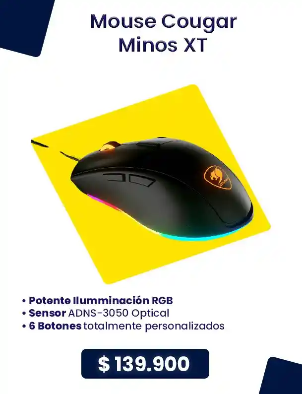 Mouse Gamer cougar Minos XT Este mouse para juegos ha sido diseñado para durar. Detrás de sus dos botones principales hay dos interruptores de juego originales que garantizan una duración de al menos 20 millones de clics . El área retroiluminada de Minos XT le permite crear la mejor atmósfera de juego para su área de juego. ¡Elija uno de los siete maravillosos modos predeterminados que preparamos para usted. Especificaciones Sensor: óptico para juegos ADNS-3050 Resolución:4000 DP Tipo de juego: FPS / MMORPG / MOBA / RTS Tasa de sondeo:1000 Hz Memoria incorporada:128 KB Software Sistema COUGAR UIX ™ Botones programables:6 Respuesta: Conmutadores para juegos de 20 millones Perfil de retroiluminación LED 3 zonas 16,8 millones de colores Interfaz: Enchufe USB Longitud del cable:1,8 m*Dimensión:125 (largo) x 68 (ancho) x 38 (alto) mm