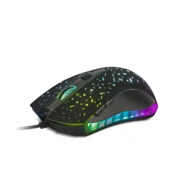 Mouse gaming 6 botones , conexión USB, Sensor: Óptico, Resolución DPI: 800/1200/1600/2400. Iluminación: Efecto de luces LED de 7 colores en modo cíclico Base del mouse: PVC, Longitud del cable:1.35 metros.