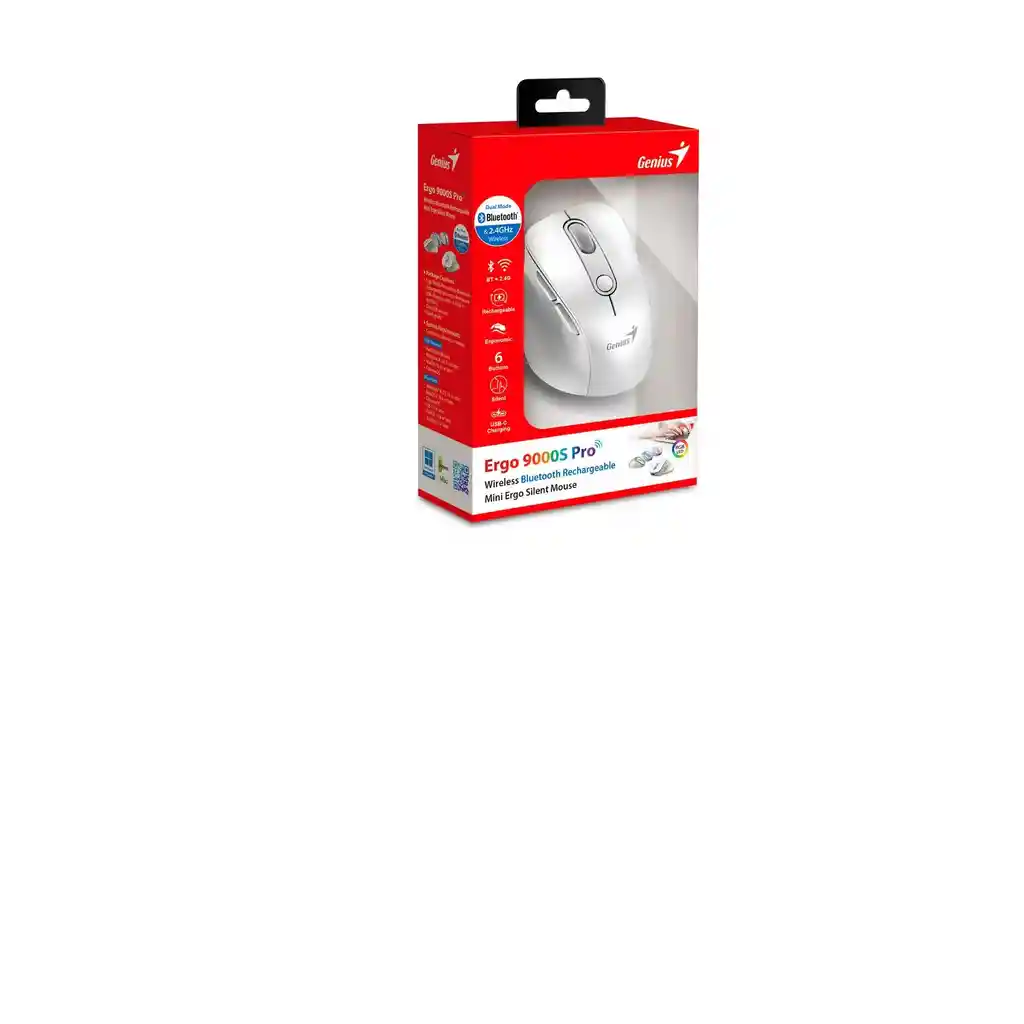 Mouse Ergo Mini 9000s Pro White, Frecuencia Bluetooth 5.0 ó 2.4GHz Nota: Modo Bluetooth & modo 2.4GHz no se pueden utilizar al mismo tiempo./Múltiple Dispositivos Hasta 3 dispositivos, dos Bluetooth + un 2.4GHz Sensor Óptico/Resolución (DPI) 800 / 1200 (defecto) / 1600 / 2400/Número de Botones 6 (Izquierda, Derecha, Botón Medio con Desplazamiento, Switch DPI, Posterior, Anterior)/Tipo de Batería: Batería recargable interna ( Antes del prime uso, cargue por 10 horas simultáneamente. )/Peso (g) Aprox. 65 g (Incluye receptor & batería interna)