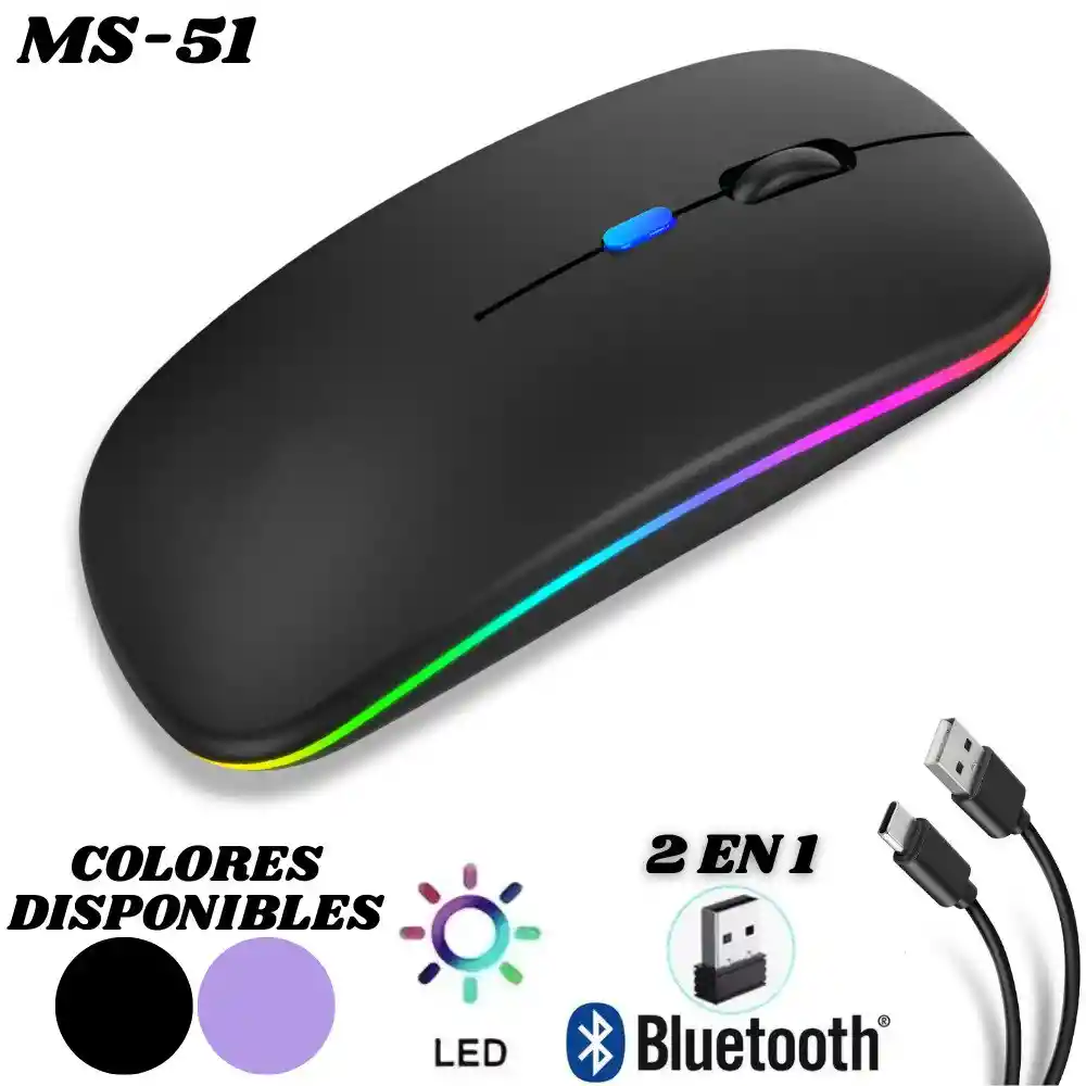 Mouse Inalambrico 2 En 1 Bluetooth Y Receptor Recargable Ms-51 Optimiza tu espacio de trabajo con el Mouse Inalámbrico MS-51, una solución de alta tecnología que combina elegancia, ergonomía y versatilidad. Gracias a su sistema 2 en 1, puedes alternar fácilmente entre la conexión Bluetooth y el receptor USB de 2.4 GHz, permitiéndote controlar múltiples dispositivos como laptops, tablets y computadoras de escritorio con un solo periférico. Su diseño ultra delgado y su batería recargable lo convierten en el compañero ideal para usuarios que buscan movilidad y estilo. Colores Disponibles: Negro Mate y Morado Claro. NOTA: selecciona color de preferencia, en caso de no ser seleccionado, se enviará color sujeto a disponibilidad. Características: - Doble Conectividad (2 en 1): Equipado con tecnología dual que permite la conexión mediante Bluetooth o a través del receptor USB incluido. - Batería Recargable: Olvídate de las pilas desechables. Incluye un cable de carga USB a Tipo-C para una recarga rápida y ecológica, asegurando largas jornadas de uso continuo. - Iluminación LED RGB: Añade un toque moderno a tu setup con su banda de luz LED dinámica que rodea la base del mouse, ofreciendo un estilo sofisticado y sutil. - Diseño Ergonómico y Silencioso: Su estructura de perfil bajo reduce la tensión en la muñeca, mientras que sus botones están diseñados para un clic suave y silencioso. - Alta Precisión: Sensor óptico avanzado que garantiza un seguimiento fluido y preciso en diversas superficies. Especificaciones: - Modelo: MS-51. - Conexión: Inalámbrica 2.4 GHz (vía receptor) y Bluetooth. - Puerto de Carga: USB Tipo-C. - Compatibilidad: Windows, macOS, Android, iOS y Linux (dispositivos compatibles con Bluetooth o puerto USB). Contenido del Paquete: 1x Mouse Inalámbrico MS-51. 1x Receptor USB (alojado en la parte inferior del mouse). 1x Cable de carga USB a Tipo-C.