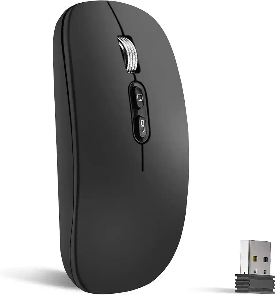 - CLIC SILENCIOSO Y ALTA RESPUESTA: este ratón inalámbrico reduce el ruido hasta en un 90%, no hay necesidad de preocuparse de que el sonido del clic moleste a los demás. Perfecto para quienes necesitan un entorno de trabajo silencioso. Desplazamiento suave, muy preciso con cada movimiento sensible. - RATÓN BLUETOOTH: Nuestro mouse de computadora se puede conectar a un dispositivo a través de Bluetooth y el otro a través del receptor USB 2.4G. - RECARGABLE: nuestro mouse bluetooth recargable tiene una batería incorporada que se puede recargar a través de un cable USB. Su modo de reposo automático y su interruptor de encendido / apagado ahorran energía para garantizar un uso intensivo de 30 días. -PORTATIL Y FÁCIL DE USAR: fácil de controlar, fácil de guardar en una bolsa para computadora portátil, perfecto para llevarlo con usted. 3 niveles de DPI ajustables (800-1200-1600 DPI), le permiten controlar libremente la velocidad del mouse. Y la forma permite el uso de la mano derecha / izquierda. Su color negro mirellado lo hace aún más hermoso. - AMPLIA COMPATIBILIDAD: compatible con Windows, iPad / iPhone (iOS13 o posterior), Mac OS X, Android y Linux. El modo inalámbrico 2.4G funciona con cualquier dispositivo que tenga interfaz USB, simplemente conéctelo y juegue.