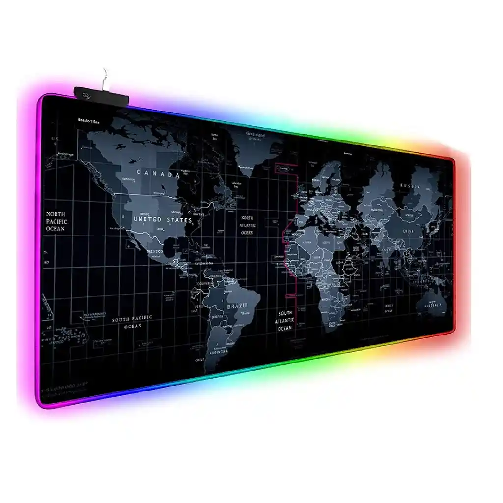 MOUSE PAD GAMER ALFOMBRA DE ESCRITORIO GIGANTE 90X40CM CON LUZ LED RGB - Edición Mapamundi Lleva tu experiencia de juego y productividad al siguiente nivel con esta Alfombrilla Mouse Pad Gigante con Luz Led RGB. Diseñada para cubrir gran parte de tu escritorio, no solo protege tu superficie, sino que ofrece un control total y un diseño sofisticado de mapa mundial en tonos oscuros que complementará perfectamente cualquier Setup de oficina o Gamer. Proporciona 14 modos de iluminación: selecciona entre 7 colores sólidos (azul, rojo, verde, blanco, morado, cian, verde) y 7 modos dinámicos multicolor. La función de memoria de apagado recuerda la última selección de modos. Crea un mundo de juego fresco y colorido para tu escritorio. CARACTERISTICAS PRINCIPALES - Alimentado por USB, plug & play - Longitud del cable de conexion: 1m - 14 modos de retroiluminación de espectro (7 colores) - Espacio Extendido: Con unas dimensiones de 90 x 40 cm, esta alfombrilla extra grande y gruesa permite ubicar cómodamente tanto el teclado como el mouse, evitando movimientos accidentales. - Superficie Ultra-Suave: Cuenta con una funda de tela de alta densidad que garantiza un deslizamiento suave y preciso, ideal para tareas que requieren velocidad y exactitud. - Máxima Durabilidad: Bordes cosidos reforzados que evitan el desgaste, la deformación o el desgomado, incluso tras un uso prolongado a altas temperaturas y presiones. - Protección Impermeable: Su revestimiento especial evita daños por derrames accidentales de líquidos. Es extremadamente fácil de limpiar basta con un paño húmedo. - Base Antideslizante de Goma: Fabricada con goma de alta calidad, la base se adhiere firmemente al escritorio para proporcionar un funcionamiento estable del mouse sin deslizamientos indeseados. - Confort y Calidad: Hecha de materiales premium, es cómoda al tacto, resistente y totalmente - Alimentado por USB, plug & play - Longitud del cable de conexion: 1m - 14 modos de retroiluminación de espectro (7 colores) - Superficie de microfibra suave optimizada para velocidad y control.
