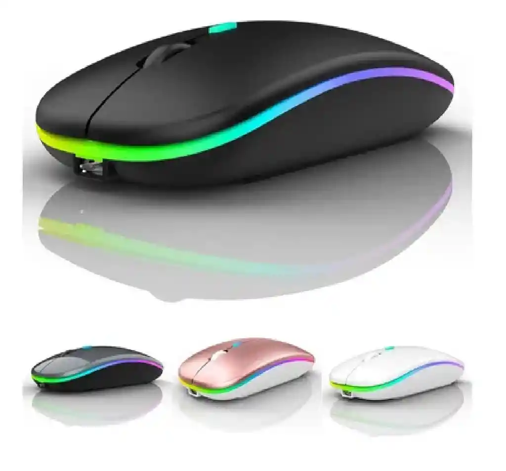 Mouse inalámbrico con LED retroiluminado, USB recargable, con Bluetooth, ratón silencioso RGB para juegos, ordenador portátil, PC, mouse para jugadores. Características del producto 1. Nueva actualización: tecnología de carga única, batería de litio integrada. 2. Diseño silencioso: el clic izquierdo y derecho son silenciosos, sin ruido al hacer clic 3. 3 tipos de DPI: Ajustable proporciona un posicionamiento preciso Especificación del producto Nombre del artículo: ratón inalámbrico 2,4G y ratón Bluetooth 5,2 Botones: 4 botones DPI máximo: 1600 DPI Interruptor DPI Ajustable: 800 /1200 / 1600DPI Alcance del WiFi: 10M Batería: recargable Longitud del Cable de carga: aproximadamente 35-45cm Vida útil del interruptor: 10 M illion T imes Tamaño: 112x58x25mm Sistema de soporte: Windows / Mac/ Android / iPadOS Paquete de embalaje 1 x ratón inalámbrico 2,4G 1 x receptor USB 1 x Cable de carga