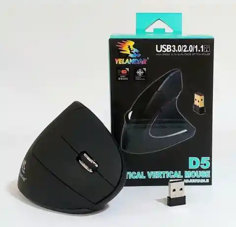 MOUSE VERTICAL INALAMBRICO 3600DPI 6 BOTONES YELANDAR Mouse vertical inalámbrico 3D de seis botones, con un revolucionario diseño ergonómico para óptima comodidad. Una postura neutra vertical alivia la tensión en la muñeca y la palma de la mano de usuarios diestros. La tecnología de 2.4GHz ofrece plena libertad inalámbrica con un alcance eficaz de 10m Elaborado con materiales de calidad, el mouse cuenta con un recubrimiento de goma para un mejor control y sujeción del dispositivo. Compartimiento integrado para guardar el receptor USB evita que se dañe o pierda Interruptor de conexión incorporado Necesita 2 Pilas triple AAA NO INCLUIDAS