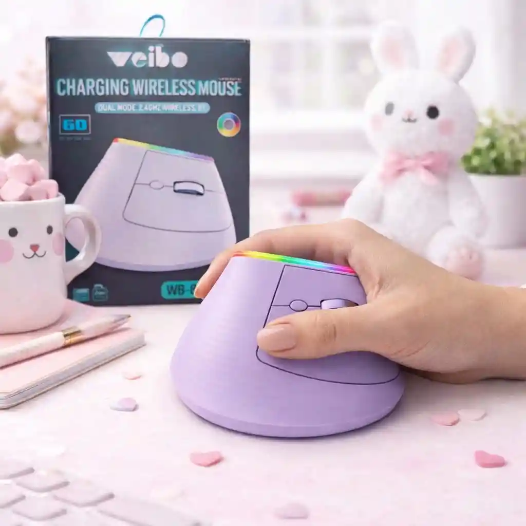 Disfruta de una experiencia de uso cómoda y moderna con el Mouse Vertical 2 en 1 Bluetooth en un elegante color lila. Su diseño ergonómico está pensado para reducir la tensión en la muñeca, permitiéndote trabajar o jugar durante largas horas sin incomodidad. Con luz RGB ajustable, agrega un toque vibrante a tu espacio. Este mouse es recargable, lo que lo hace práctico y ecológico. Con tecnología Bluetooth, te conecta de manera eficiente a tus dispositivos sin cables, y funciona tanto con la modalidad inalámbrica como con la opción de 2.4GHz. Nota importante: Este paquete incluye solo un mouse.Demas accesorios son para ambientar la fotografía. Ideal para quienes buscan mejorar su rendimiento y estilo al mismo tiempo. Color: Lila