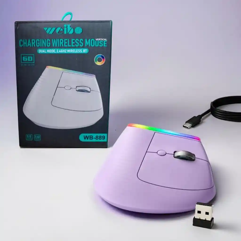 Disfruta de una experiencia de uso cómoda y moderna con el Mouse Vertical 2 en 1 Bluetooth en un elegante color lila. Su diseño ergonómico está pensado para reducir la tensión en la muñeca, permitiéndote trabajar o jugar durante largas horas sin incomodidad. Con luz RGB ajustable, agrega un toque vibrante a tu espacio. Este mouse es recargable, lo que lo hace práctico y ecológico. Con tecnología Bluetooth, te conecta de manera eficiente a tus dispositivos sin cables, y funciona tanto con la modalidad inalámbrica como con la opción de 2.4GHz. Nota importante: Este paquete incluye solo un mouse.Demas accesorios son para ambientar la fotografía. Ideal para quienes buscan mejorar su rendimiento y estilo al mismo tiempo. Color: Lila