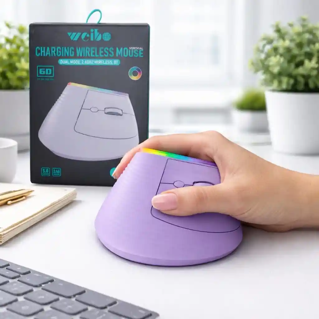 Disfruta de una experiencia de uso cómoda y moderna con el Mouse Vertical 2 en 1 Bluetooth en un elegante color lila. Su diseño ergonómico está pensado para reducir la tensión en la muñeca, permitiéndote trabajar o jugar durante largas horas sin incomodidad. Con luz RGB ajustable, agrega un toque vibrante a tu espacio. Este mouse es recargable, lo que lo hace práctico y ecológico. Con tecnología Bluetooth, te conecta de manera eficiente a tus dispositivos sin cables, y funciona tanto con la modalidad inalámbrica como con la opción de 2.4GHz. Nota importante: Este paquete incluye solo un mouse.Demas accesorios son para ambientar la fotografía. Ideal para quienes buscan mejorar su rendimiento y estilo al mismo tiempo. Color: Lila