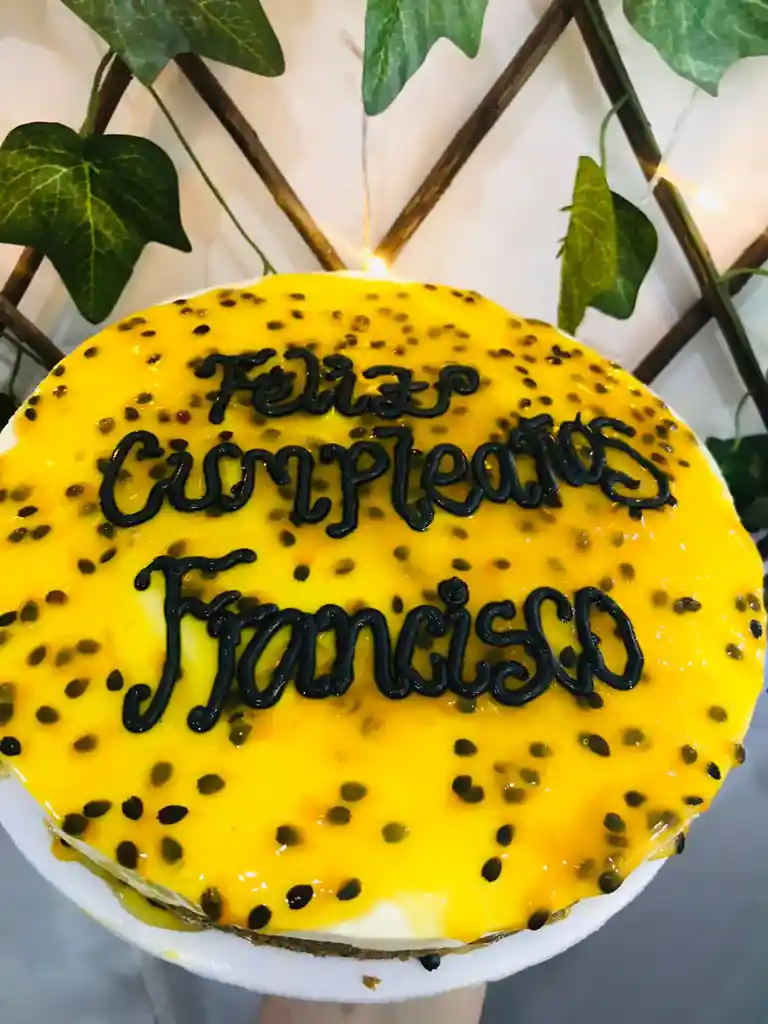 Cremoso Mousse completo sobre una base de chocolate cubierto con una deliciosa salsa de maracuya. 8 generosas porciones