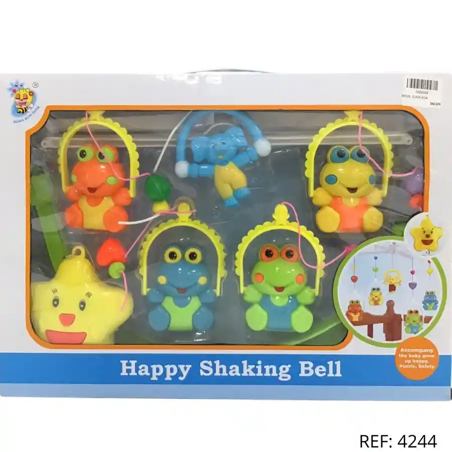 Móvil musical de cuna con figuras colgantes y campana giratoria. Estimula sentidos y relaja al bebé.