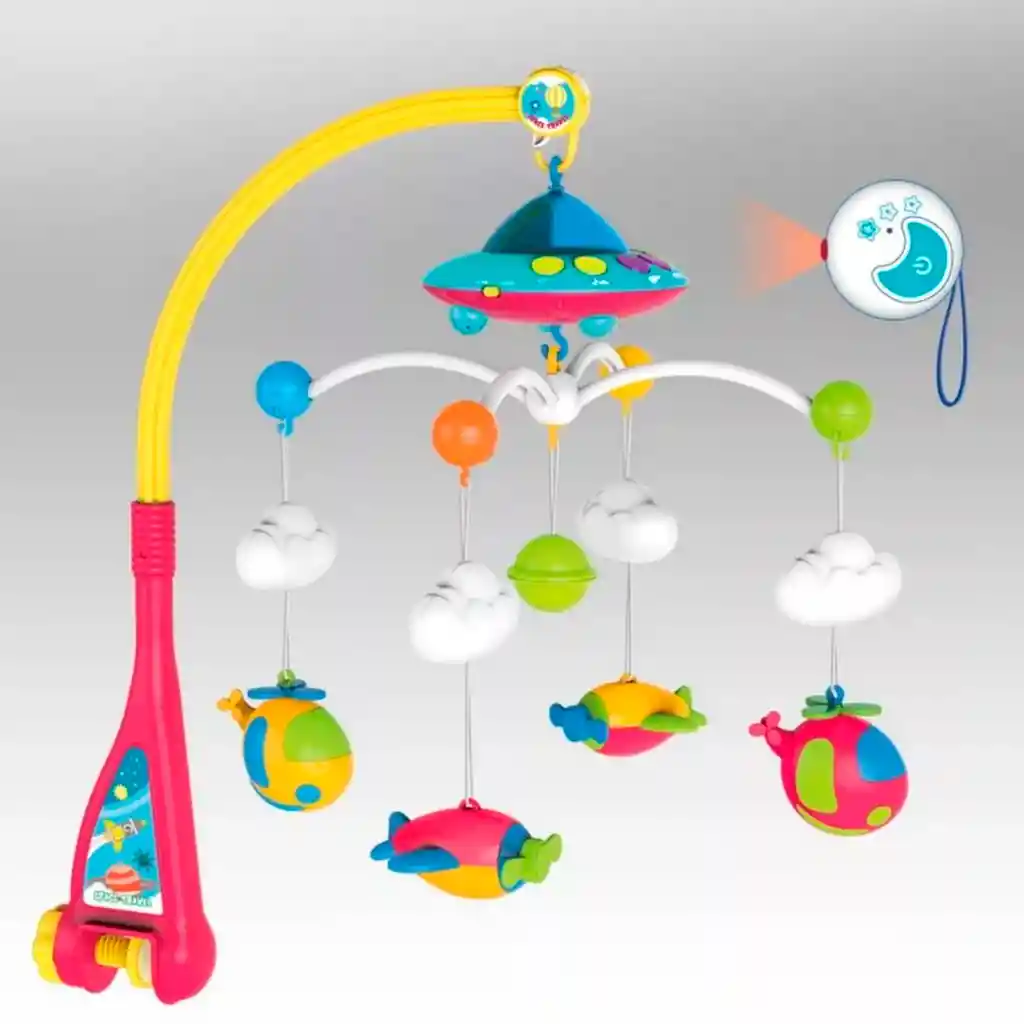Hermoso móvil para bebé colorido con música, ofrece un espectáculo de luces fascinantes con figuras de animales con movimiento y proyector de luz, incluye control remoto y 4 peluches, múltiples sonidos de animales y de la naturaleza, contiene un temporizador de 10, 20 y 30 min, contiene además proyector de estrellitas, espejo de auto reconocimiento y bluetooth, está elaborado en plástico y algodón antialérgico para colgar en la habitación del bebé.