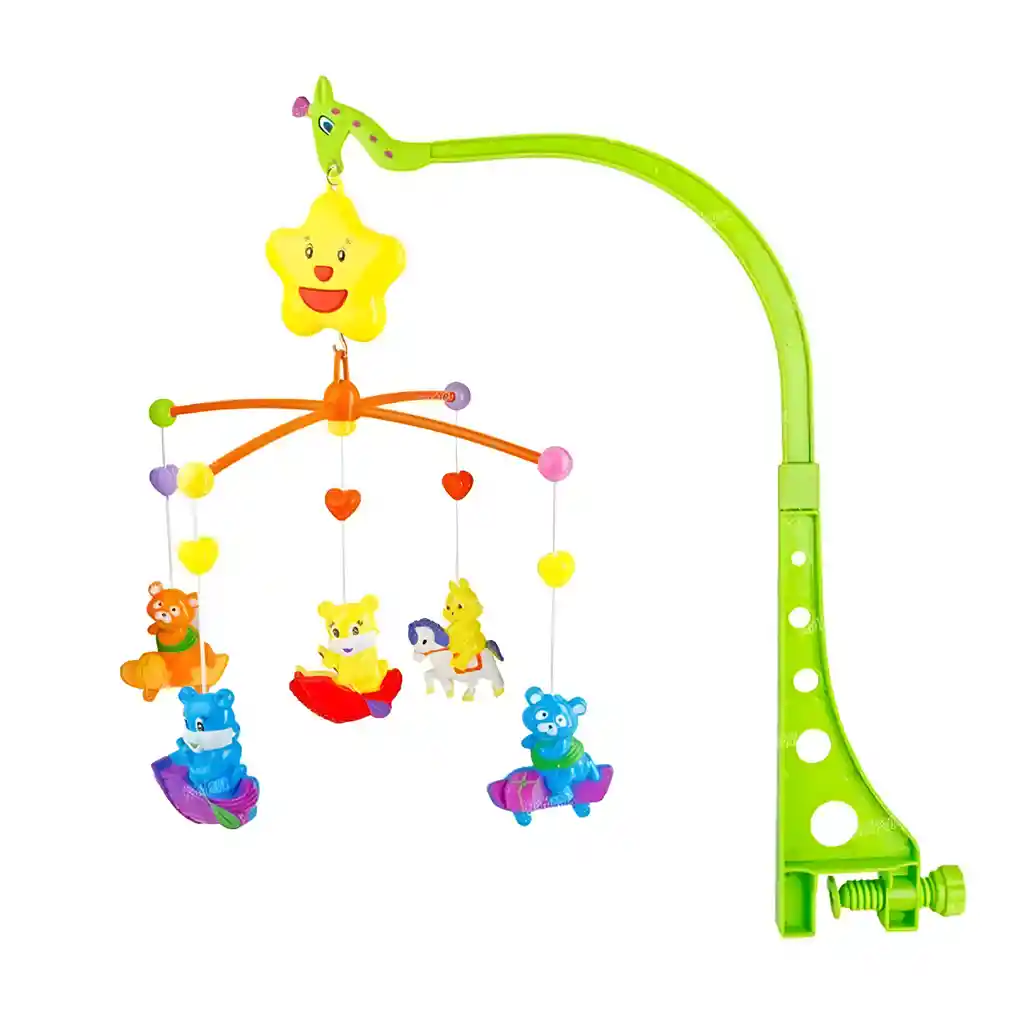 Este encantador móvil para bebés, con cinco ositos adorables, es colorido y divertido, además de ser una herramienta ideal para fomentar el desarrollo de habilidades clave en los más pequeños: promueve el movimiento de las manos, estimula la capacidad ocular, mejora la motricidad fina, y potencia la audición, el ritmo y la percepción sensorial. Funciona sin necesidad de baterías, gracias a un mecanismo de cuerda que, al girar una palanca mágica detrás de la estrella, activa una encantadora orquesta de ositos que giran suavemente al ritmo de una melodía tranquila, similar a un carrusel. /// El móvil se instala en el lateral de la cuna/// Ficha Técnica: Medida de conejos : 6 cm x 8 cm aprox Material de los conejos : Plastico ABS Soporte de plástico no toxico Altura de soporte: 48 cm Medidas empaque 38 cm x 23 cm x 5 cm Incluye caja musical de cuerda giratoria ( Estrella ) Certificado de conformidad: E5-0359-2021 Referencia: C4050 ** _Para defectos de fábrica o retractos: \_Por favor revise el producto apenas lo reciba y antes de usarlo. No aplican ley de retracto o defectos de fábrica luego de usar el producto. Se manejan máximo 5 días para reportar defectos de fábrica (por ejemplo, producto funciona mal, piezas faltantes, rotas, etc). Para hacer efectiva la devolución el producto debe devolverse con el empaque original, el cual debe estar en buen estado, incluir todos los documentos y las partes completas y sin daños.