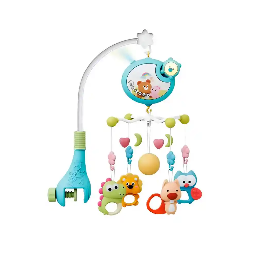 Este tierno móvil musical para cuna es perfecto para acompañar el descanso y la diversión de los bebés, ya que incluye divertidos sonajeros masticables con formas de animalitos que ayudan en la etapa de dentición, proyección de luces relajantes, música con temporizador programable y control remoto para mayor comodidad de los padres; su diseño colorido y seguro estimula la vista, el oído y la coordinación del bebé, convirtiéndose en un accesorio indispensable para calmar, entretener y favorecer el desarrollo temprano desde los primeros meses de vida. Ficha Técnica: Dimensiones : 48 cm x 40 cm x 25 cm Material : Plástico ABS Funcionamiento: 3 Baterias AAA ( Incluidas ) Edad Recomendada : + 0 MESES Certificado de conformidad: SL-CS-210044 Referencia: C4415 ** _Para defectos de fábrica o retractos: \_Por favor revise el producto apenas lo reciba y antes de usarlo. No aplican ley de retracto o defectos de fábrica luego de usar el producto. Se manejan máximo 5 días para reportar defectos de fábrica (por ejemplo, producto funciona mal, piezas faltantes, rotas, etc). Para hacer efectiva la devolución el producto debe devolverse con el empaque original, el cual debe estar en buen estado, incluir todos los documentos y las partes completas y sin daños.