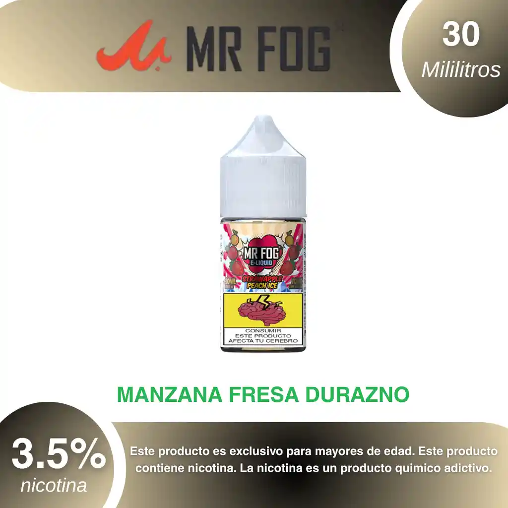Mr Fog Sales Sabor Fresa Manzana durazno 3.5% PROHIBIDA LA VENTA A MENORES DE EDAD. ADVERTENCIA: ESTE PRODUCTO CONTIENE NICOTINA, LA NICOTINA ES UNA SUSTANCIA QUIMICA ADICTIVA Y NOCIVA PARA LA SALUD. Los líquidos para vapeo contienen: propilenglicol USP, glicerina USP, sabor artificial y nicotina. Este producto puede contener nicotina, una sustancia altamente adictiva que puede generar dependencia, posibles afectaciones arteriales, cardiacas, pulmonares y otras aun no identificadas. No se recomienda su uso a mujeres en embarazo, puede generar lesiones al feto. Mantener alejado de niños y mascotas. No ingerir, puede generar irritación y/o intoxicación. Por favor antes de consumir consulte a su médico posibles afectaciones o sensibilidad a alguno de sus componentes. Los componentes de este producto pueden aumentar la sensación de ansiedad En caso de notar alguna reacción adversa por favor suspenda su uso de manera inmediata. Siga las instrucciones en el envase. No alterar sus componentes. Adquiera sus productos en sitios de confianza No use productos piratas, alterados, o en los cuales no pueda comprobar su buena procedencia, Verifique la reputación del fabricante y distribuidor antes de adquirir cualquier producto Si no es usuario fumador o vapeador no se recomienda su uso bajo ninguna circunstancia Al usar este producto usted es consciente que este producto puede generar afectaciones a su salud, incluyendo aquellas que a la fecha de la compra no se han identificado y que pueden aparecer a largo plazo