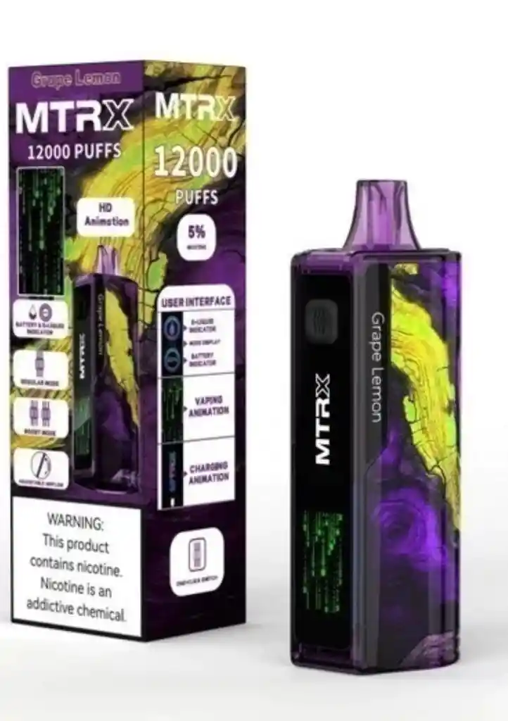 El MTRX es un vapo recargable de última tecnología, diseñado para ofrecer hasta 12,000 inhalaciones con una carga. Con un nivel de nicotina del 5%, su potente batería y sistema de interfaz digital, brinda una experiencia de vapeo óptima CARACTERÍSTICAS: - Hasta 12,000 puffs por dispositivo. - Concentración de nicotina al 5%. - Interfaz digital con indicador de nivel de líquido, batería y animación de vapeo. - Tapa y cuerpo duraderos con recarga mediante puerto USB-C. - Modos de vapeo: Regular y Boost.