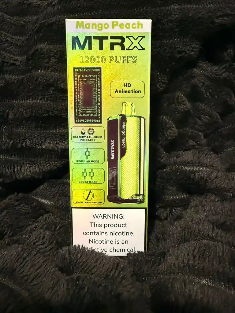 El MTRX es un vapo recargable de última tecnología, diseñado para ofrecer hasta 12,000 inhalaciones con una carga. Con un nivel de nicotina del 5%, su potente batería y sistema de interfaz digital, brinda una experiencia de vapeo óptima CARACTERÍSTICAS: - Hasta 12,000 puffs por dispositivo. - Concentración de nicotina al 5%. - Interfaz digital con indicador de nivel de líquido, batería y animación de vapeo. - Tapa y cuerpo duraderos con recarga mediante puerto USB-C. - Modos de vapeo: Regular y Boost.