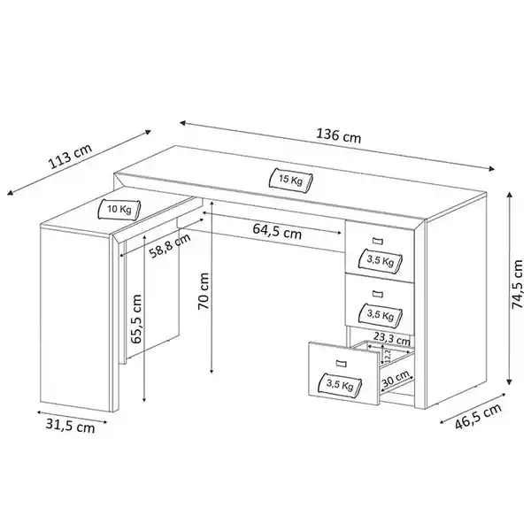 El Escritorio en “L” Siena es un Mueble de Fácil Armado Para el Hogar u Oficina Que Por su Diseño Brinda Amplitud Al Lugar en el Que se Ubique, Permitiendo Además la Optimización de Espacios. Ha Sido Producido Con Aglomerado de Madera y su Acabado en Melamina Garantiza Mayor Resistencia y Durabilidad. Con Sus Productos, Muebles 2020 Quiere Generar Ideas Para Darle Una Nueva Vida a Los Hogares. Cada Mueble es Una Mezcla de Creatividad, Diseño, Funcionalidad y Mucha Dedicación. Largo: 136 cm Alto: 74,5 cm Profundo: 113 cm Peso Recomendado: 15 Kg en la Tapa Principal, 10 Kg en la Secundaria y 3,5 Kg en Cada Cajón Aglomerado de Madera Acabado en Melamina Incluye: Tres (3) Cajones Tres (3) Manijas Kit de Herrajes Manual de Armado no Incluye: Accesorios Producto Ambientado, no Incluye Accesorios. El Color de la Imagen es de Referencia y Puede Tener Variaciones en el Producto Real. Se Recomienda Que el Producto Sea Armado Por un Experto, o en su Defecto Que se Usen Las Herramientas Adecuadas, Según lo Establecido en el Manual de Armado. Si el Cliente Decide Armar él Mismo el Mueble, en Caso de Daño Por Una Instalación Indebida, o no Tomando en Cuenta Las Instrucciones Señaladas en el Documento de Instrucciones de Armado, Deberá Cubrir el Costo de Reparación.