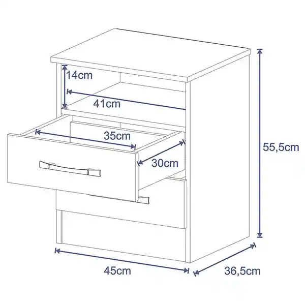 La Mesa de Noche Versátil es un Mueble de Fácil Armado Con Diseño Minimalista Que Optimizará Los Espacios de su Habitación. Sus Dos Cajones y Amplio Espacio Interior es Ideal Para Ubicar Elementos de Uso Diario. Ha Sido Producido Con Aglomerado de Madera y su Acabado en Pintura a Través Del Sistema de Impresión Con Secado Uv, Garantiza Mayor Resistencia y Durabilidad. Con Sus Productos, Muebles 2020 Quiere Generar Ideas Para Darle Una Nueva Vida a Los Hogares. Cada Mueble es Una Mezcla de Creatividad, Diseño, Funcionalidad y Mucha Dedicación. Alto: 55,5 cm Largo: 45 cm Profundo: 36,5 cm Cuerpo, Laterales y Frentes de Los Cajones en Mdp de 15 mm. Respaldo en Mdf de 3 mm. Acabado en Pintura a Través Del Sistema de Impresión Con Secado Uv en Línea. Incluye: Dos (2) Cajones Dos (2) Manijas en Aluminio un (1) Entrepaño Kit de Herrajes Manual de Armado no Incluye: Accesorios Producto Ambientado, no Incluye Accesorios. El Color de la Imagen es de Referencia y Puede Tener Variaciones en el Producto Real. Se Recomienda Que el Producto Sea Armado Por un Experto, o en su Defecto Que se Usen Las Herramientas Adecuadas, Según lo Establecido en el Manual de Armado. Si el Cliente Decide Armar él Mismo el Mueble, en Caso de Daño Por Una Instalación Indebida, o no Tomando en Cuenta Las Instrucciones Señaladas en el Documento de Instrucciones de Armado, Deberá Cubrir el Costo de Reparación.