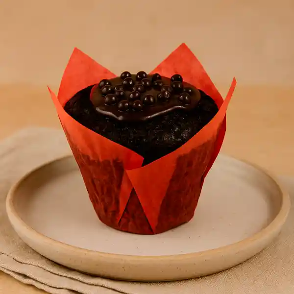El Muffin de Chocolate con Nutella es un bizcocho esponjoso y húmedo, elaborado con cacao intenso y decorado con perlas de chocolate que aportan un sutil contraste crujiente.