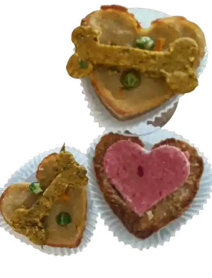 Muffin de pollo zanahoria y alverja En forma de corazón o huellita. Te los entregamos recién horneados, Quieres varios? Los puedes refrigerar hasta por 5 días o congelar hasta x 3 meses. Sacas atemperas y sirves a tu amigo peludo..