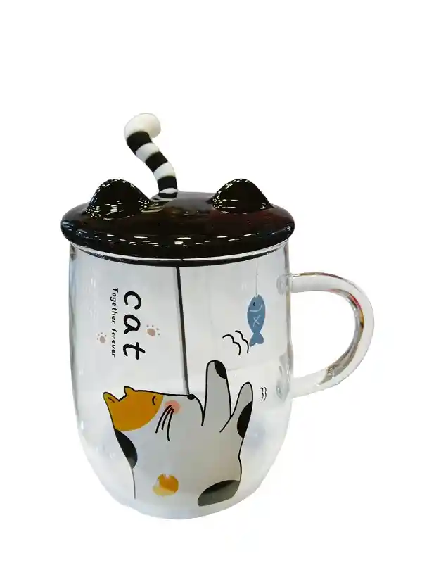 POCILLO GRANDE EN VIDRIO RESISTENTE AL CALOR MOTIVO GATO TRI COLOR TAPA EN CERAMICA CON EREJAS 3D INCLUYE CUCHRA CON PIN EN PVC EN FORMA DE COLA, ALTO RELIEVE FULL COLOR.