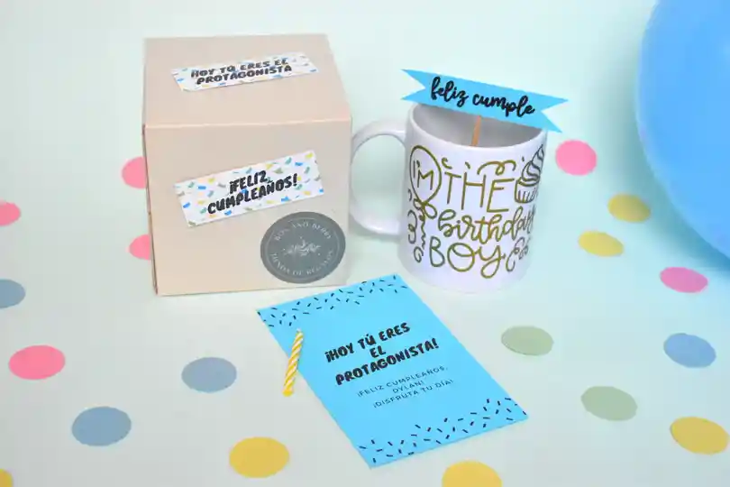 ¿Alguna celebración? Nuestro mug celebración incluye mug con mensaje personalizado, caja decorada, tarjeta con mensaje personalizado, tarjeta y vela “Los mejores deseos para ti”