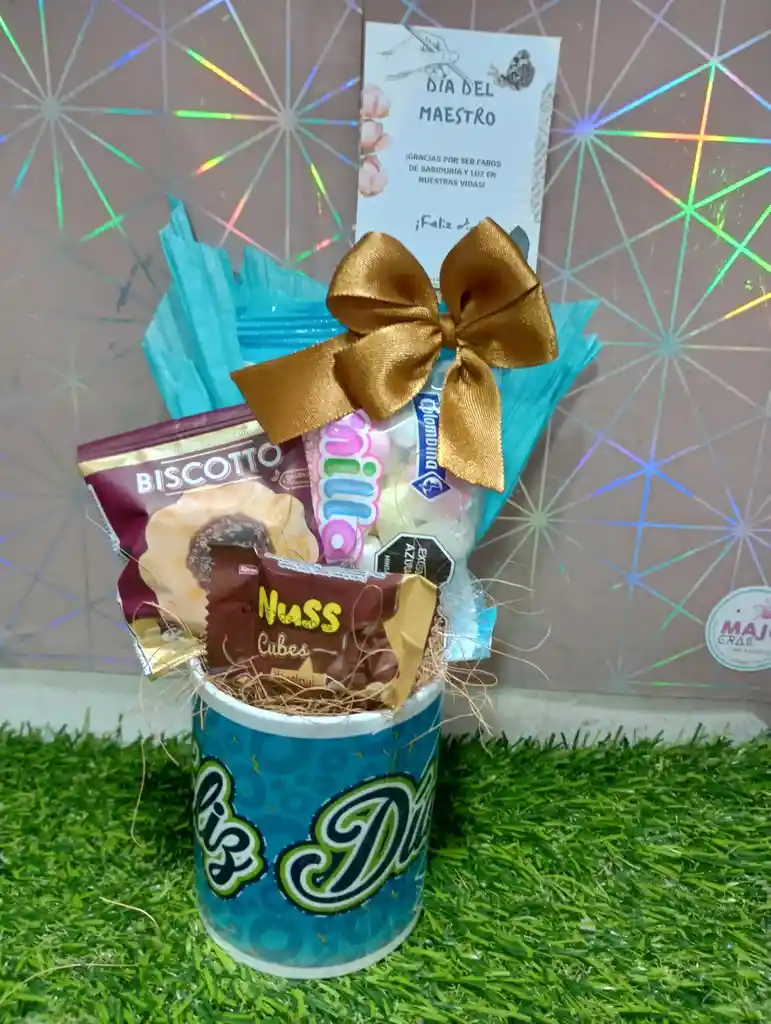 hermoso mug masculino o femenino (Estilo según disponibilidad) con variedad de galletas y dulces.