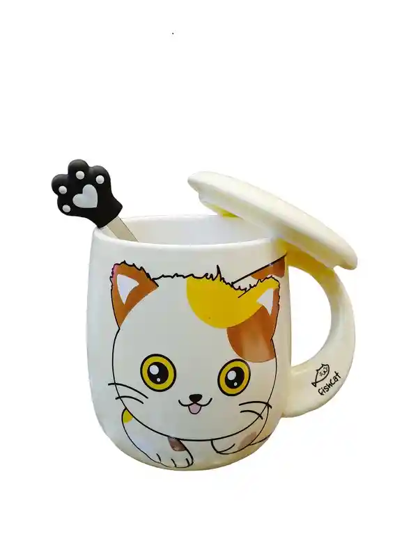 POCILLO GRANDE EN CERAMICA MOTIVO GATO INCLUYE TAPA PARA MANTENER EL CALOR TRAE CUCHARA PARA MEZCLAR LA CUCHRA INCLUYE PIN EN FORMA DE HUELLA DE ALTO RELIEVE EN PVC RESISTENTE AL CALOR.