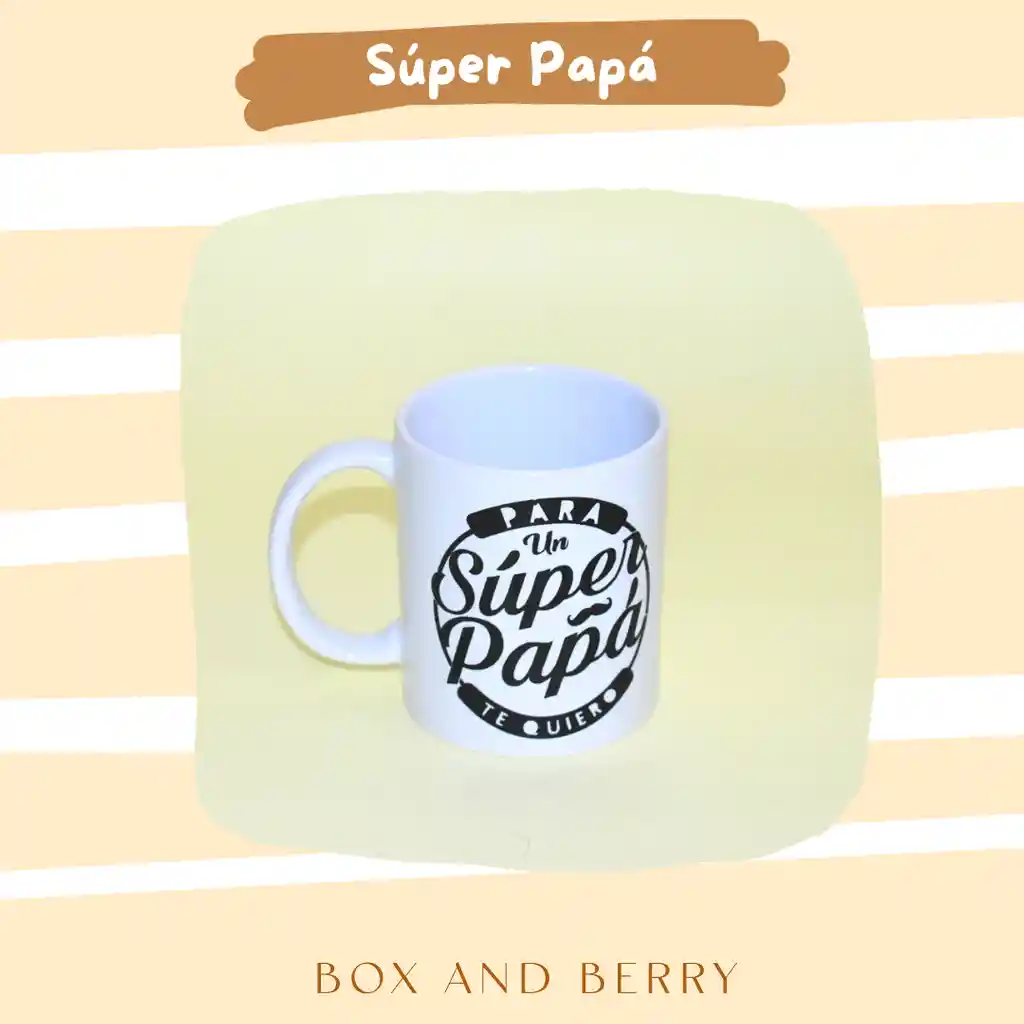 Mug en cerámica con mensaje Para un Súper Papá Te Quiero. Incluye caja decorada y tarjeta con mensaje personalizado. Enviar el mensaje para la tarjeta vía chat