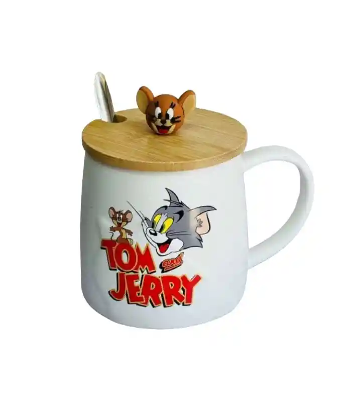 MUG TAZA POCILLO VASO CERAMICA TAPA Y CUCHARA MOTIVO JERRY-TOM Y JERRY