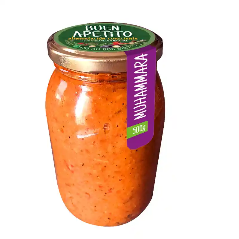 MUHAMMARA ESPARCIBLE DULCE/PICANTE – CREMA DE PIMENTONES ASADOS CON NUECES DEL BRASIL, MELAZA DE GRANADA O MIEL DE ABEJAS, PÁPRIKA, COMINO, LIMÓN Y CHILES PICANTES. ALIMENTO VEGANO.