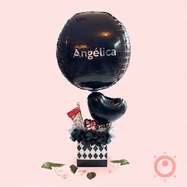 Caja mediana con tapa Papel seda 1 Burbuja pequeña marcada con 2 globos R5 1 Moño grande 1 Mesaje mediano 2 palos Piazza 1 Paquete de mani especial 1 Chocolatina Jet 1 Bom bom italo 1 Nutella pequeña 3 Millows