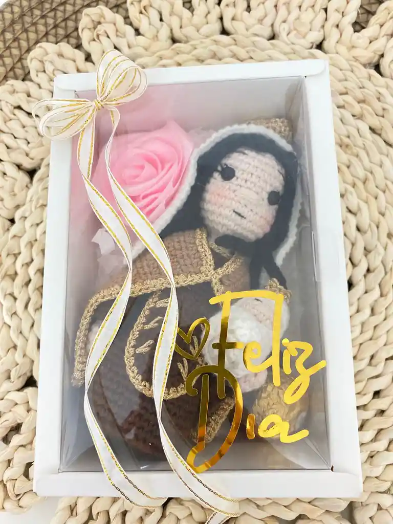 Hermosa cajita con Virgen María advocación Del Carmen con Niño Jesús en crochet, hecha a mano, rosa eñ tema y chocolate Ferrero Rocher. Tarjeta y decoración.
