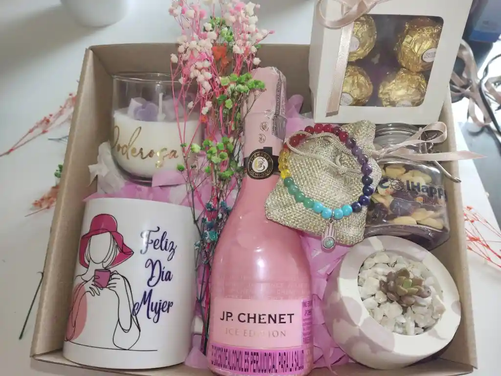 Vela artesanal mensaje según disponibilidad Mini suculenta en maceta de cemento Vino rosado JP Chenet 200 ml Pulsera piedra natural 8mm Taza diseño según disponibilidad Caja con 4 chocolates Ferrero Frasco de vidrio con frutos secos Caja de empaque con 3 mini globos Ramito flores secas